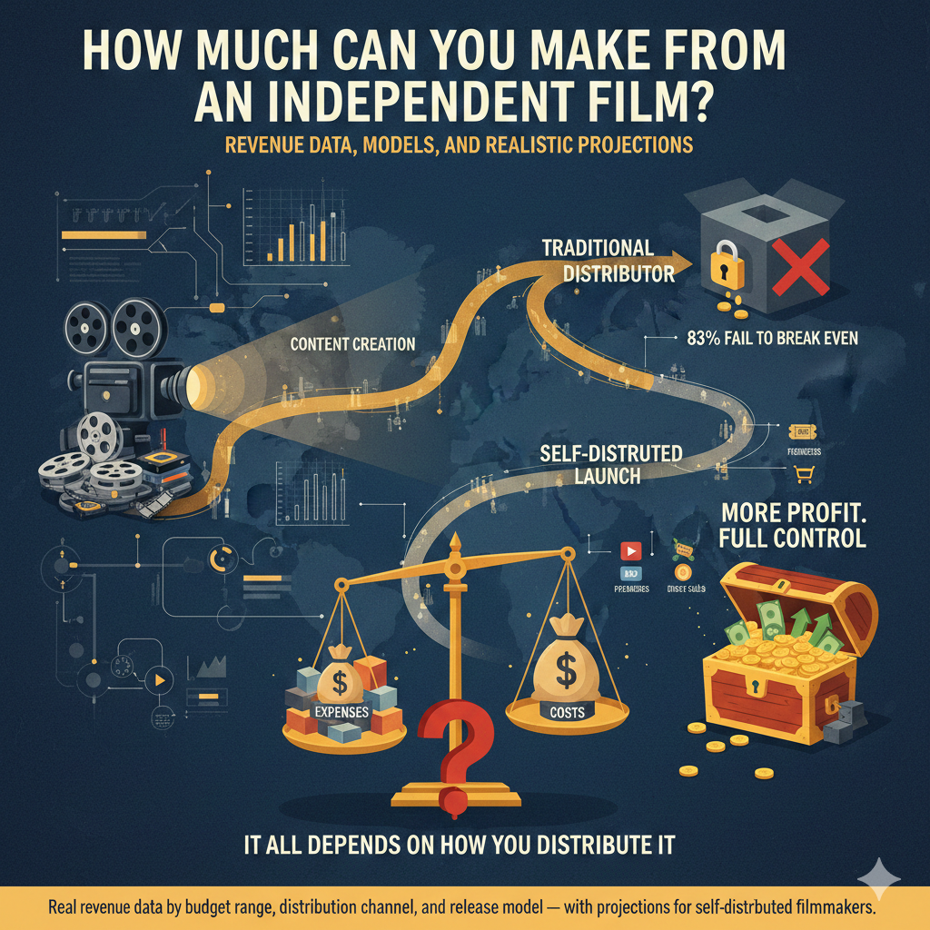 This article breaks down how much independent filmmakers actually earn, organized by budget range, distribution channel, and release model. It includes realistic revenue projections for self-distributed films — because that's where the data shows the best chance of return.